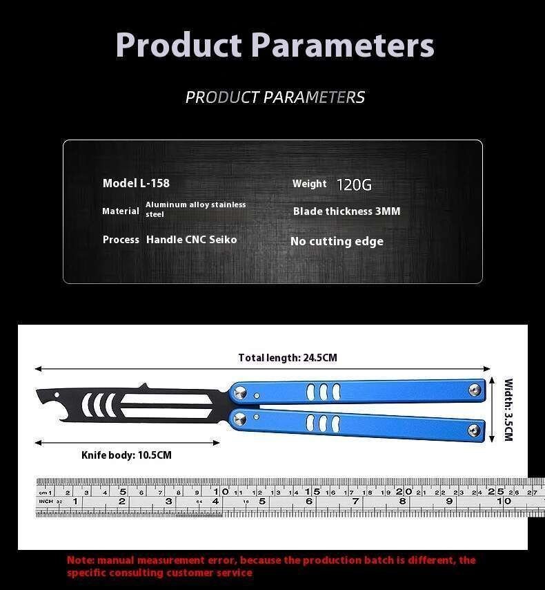 Total length: 255mm (10 inches) Blade length: 110mm (4.33 inches) Handle: 145mm (5.70 inches) Blade thickness: 3mm (0.118 inches) Blade width: 26.8mm (1.05 inches) Handle thickness: 12.6mm (0.49 inches) Hardness: 56-58HRC Blade material: 440 Handle material: Integrated aviation aluminum 6061-T6 System: Shaft sleeve Net weight: 109gV4 Butterfly 6061 Aluminium Bright Slot Training Balisong Messer